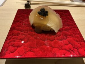 炙った熊本の30キロのクエにスッポン出汁の煮凝りをかけてあります。